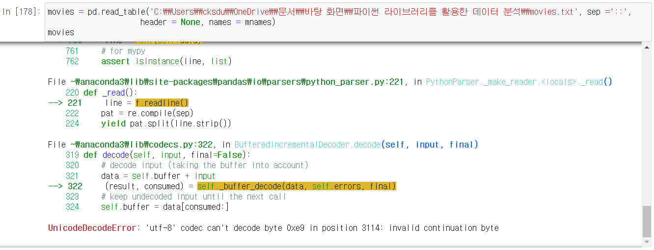 이 때문에 'utf-8' codec can't decode byte 0xe9 in position 과 같은 오류가 발생하였을 때 많은 사람들이 encoding = 'cp949'를 추가하면 해결된다고 이야기하는 것이다. 하지만 나의 경우 해결되지 않았다.