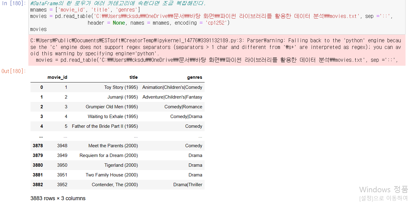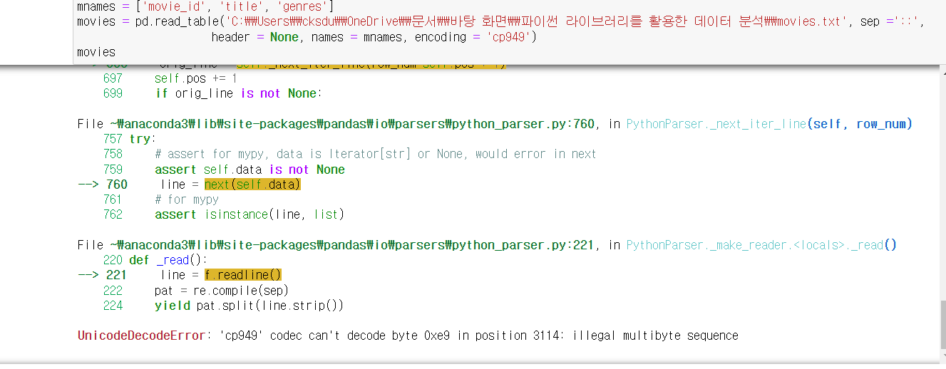 cp949는 분명 한글을 위한 인코딩이라고 했다. 그리고 해당 데이터는 GroupLens 연구소에서 1990년대 말부터 2000년대 초까지 MovieLens 사용자로부터 수집한 방대한 영화 평점 데이터이다. 때문에 영어권 인코딩을 사용할 필요가 있었다.