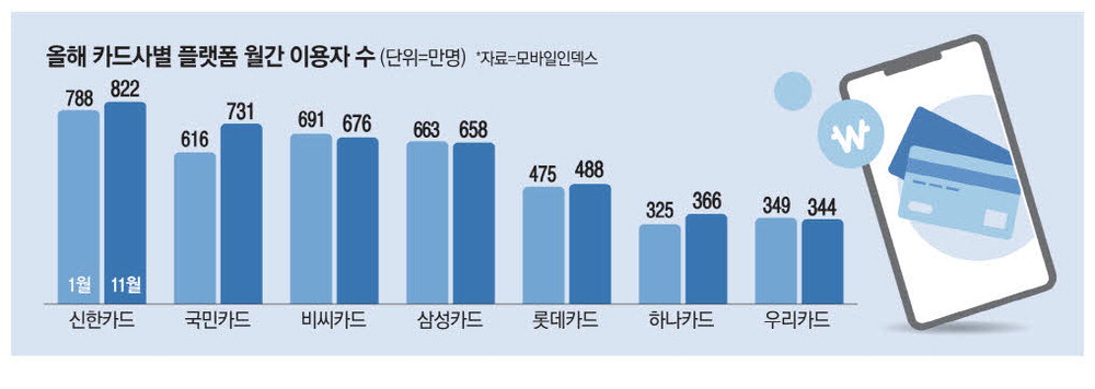 빅데이터 플랫폼 기업 아이지에이웍스의 모바일인덱스에 따르면 지난달 국내 주요 카드사들이 운영 중인 종합 금융 플랫폼의 월간 이용자 수(MAU)는 올해 초보다 늘어난 것으로 나타났다. 이 중 상승 폭이 가장 컸던 KB Pay는 올해 1월 616만3849명에서 11월 731만1212명으로 115만명 가까이 이용자 수가 증가했다.