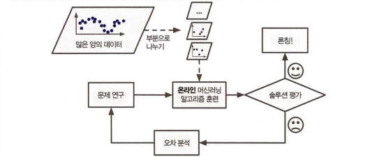 온라인 학습은 데이터를 순차적으로 한 개씩 또는 미니배치라 부르는 작은 묶음 단위로 주입하여 시스템을 훈련시킨다. 매 학습 단계가 빠르고 비용이 적게 들기 때문에 시스템은 데이터가 도착하는 대로 즉시 학습할 수 있다.