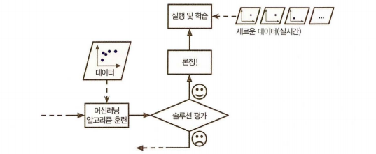 머신러닝의 경우 시스템을 훈련, 평가, 론칭하는 전체 과정이 쉽게 자동화될 수 있기 때문에 이러한 배치 학습 시스템에도 적응이 가능하다. 데이터를 업데이트하고 시스템의 새 버전을 필요한 만큼 자주 훈련시켜야 할 것이다.